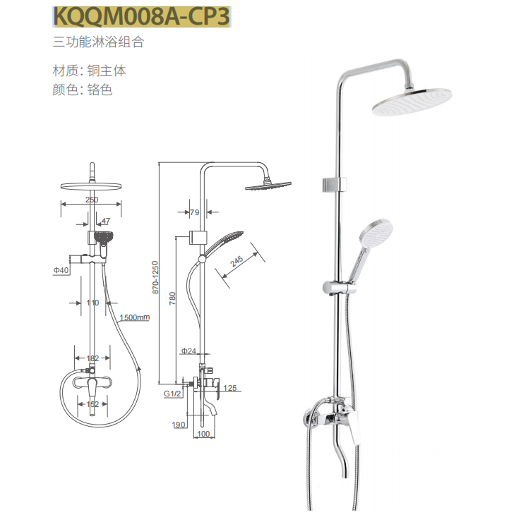 浪舰三功能淋浴花洒KQQM008A-CP3铬色